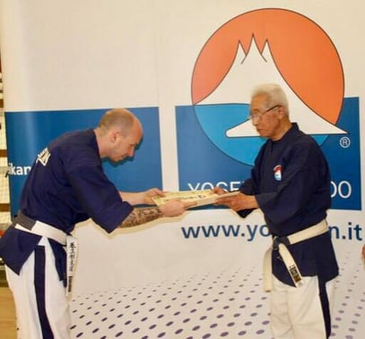 Manuel Palmieri aus dem Trainerteam des SSV Taufers Yoseikan Budo wird von Soke Hiroo Mochizuki das Diplom zum 2. Dan Yoseikan Budo überreicht.